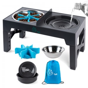 높낮이 조절 가능한 스탠드와 천천히 먹게 해주는 밥그릇, 튀지않는 물그릇 (A height-adjustable stand, a slow feeder bowl, and a non-spill water bowl.)