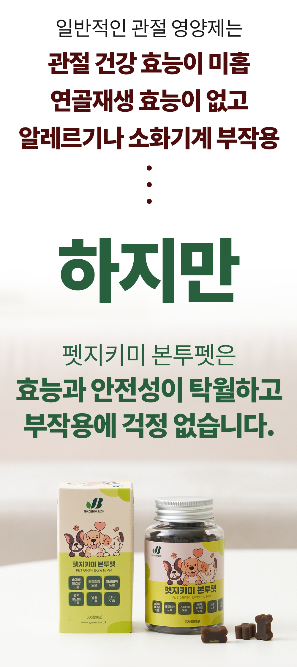 일반적으로 쓰이는 원료들이 들어간 관절 영양제는 관절 건강 효능이 미흡하고, 연골재생 효능이 없고, 알레르기나 소화기계 부작용을 만들어, 장기 복용이 불가능했습니다. 하지만, 펫지키미 본투펫은 효능과 안정성이 탁월하고 부작용에 걱정 없습니다.