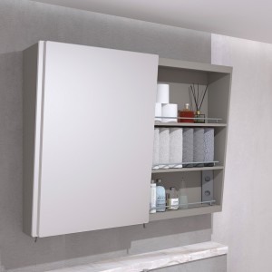 도어 거울이 기울기가 있어 사회적 약자가 사용하기 좋은 유니버셜 디자인의 욕실 수납장. 도어 거울의 기울기때문에 얼굴이 더 가까이 보여지고 수납공간이 더 확보되어 실용성있고 편리함.